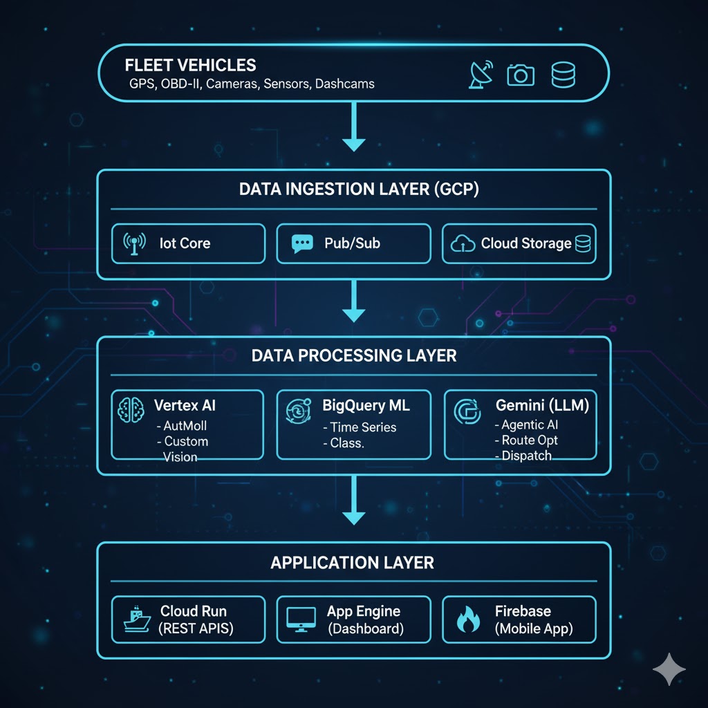 Our GCP-based fleet management AI system consists of five core layers:
